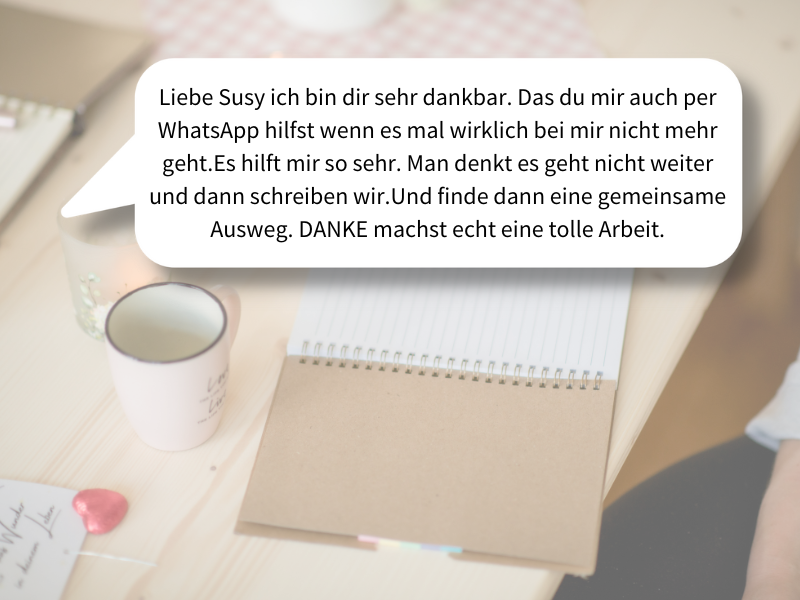 „Danke für die tolle und einfühlsame Unterstützung! Man fühlt sich hier einfach wohl, verstanden und bekommt man Susann nicht nur eine Begleitung sondern auch eine „Freundin“.“